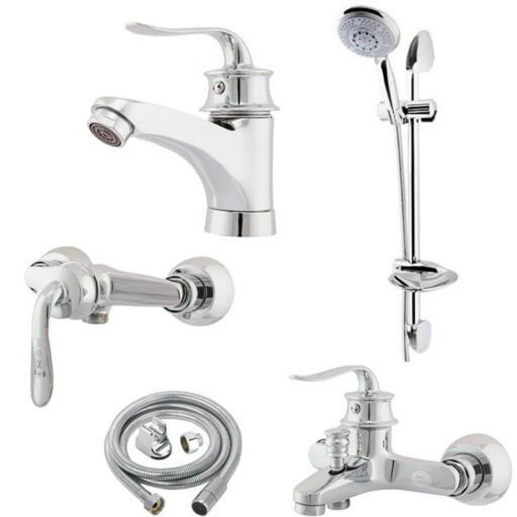 ست پنج تیکه شیرالات شامل شیر دوش و افتابه و روشویی قاصدک کروم علم دوش یونیکا کروم و شیلنگ توالت کروم